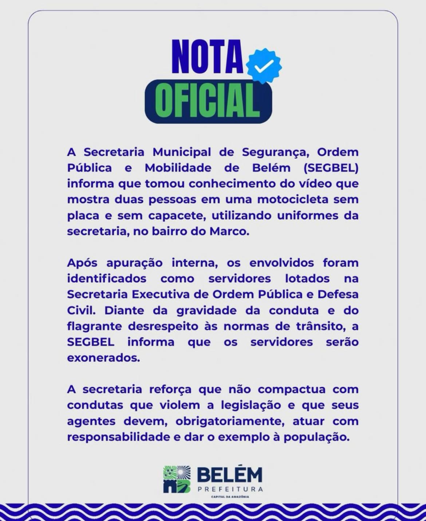 Servidores da Secretaria Municipal de Segurança, Ordem Pública e Mobilidade (Segbel) foram flagrados na Travessa Lomas Valentinas, no bairro do Marco, em Belém, trafegando em uma motocicleta sem placa e ambos estavam sem capacete.