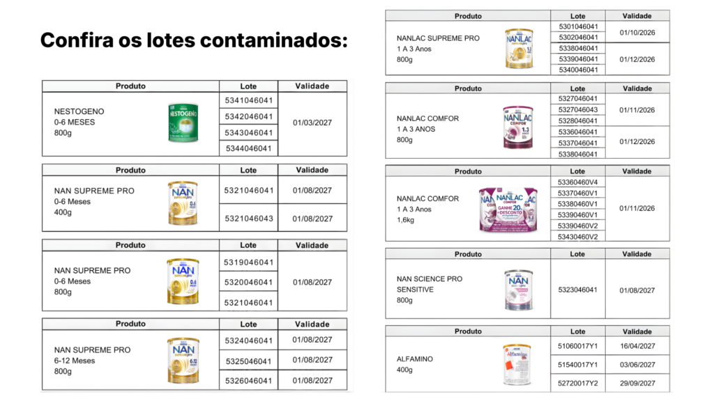 No Brasil, apenas os lotes específicos indicados no recolhimento foram afetados. A Anvisa orienta pais e responsáveis a verificarem o número do lote impresso no rótulo das fórmulas infantis. Caso o produto pertença a um dos lotes recolhidos, ele não deve ser utilizado nem oferecido às crianças. Os demais lotes das mesmas marcas seguem liberados para consumo.