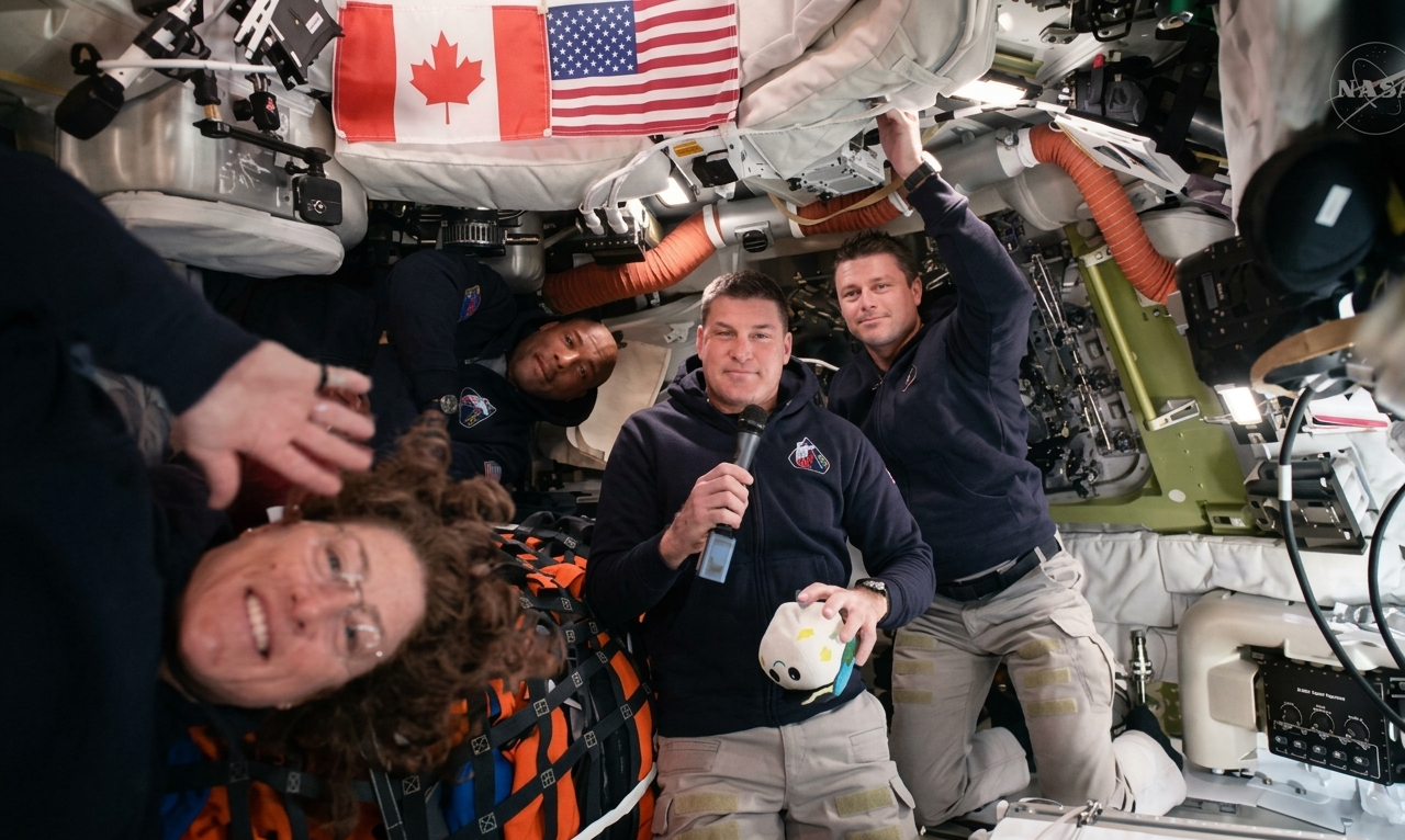 Uma imagem divulgada pela Nasa mostra a cápsula em pleno espaço profundo, com a Lua ao fundo, capturada por uma câmera na extremidade de um painel solar da nave. A fotografia oferece um ângulo incomum do satélite e destaca o contraste entre a nave e a escuridão do espaço. Segundo Glover, a tripulação registrou outras imagens detalhadas da superfície lunar, incluindo a Bacia Oriental, uma enorme formação de impacto. A perspectiva dessas fotos reforça a sensação da distância percorrida: a Terra aparece cada vez menor, enquanto a Lua domina o campo de visão.