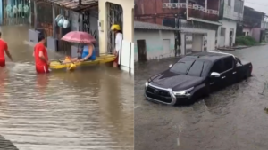 O Corpo de Bombeiros foi acionado para realizar o resgate de idosos que ficaram “ilhados” em suas residências, devido ao nível elevado das águas. Outras imagens também mostram motociclistas e outros condutores se arriscando em vias inundadas.