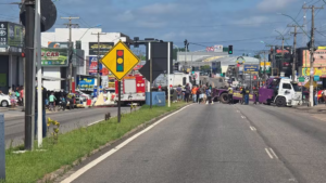 O motorista informou que seguia do interior para a capital transportando a carga, quando um veículo parou bruscamente à sua frente, obrigando-o a desviar para evitar a colisão. Na manobra, o veículo atingiu uma mureta e acabou tombando na rodovia.