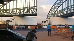 Uma carreta ficou engatada na nova passarela da Avenida Júlio César, em Belém, nesta sexta-feira (24), provocando transtornos no trânsito da região. Moradores registraram vídeos do incidente, que resultou na interdição parcial da via.