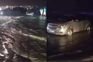 As imagens mostram o avanço do mar sobre a faixa de areia e motoristas tentando retirar os carros antes que a água alcançasse níveis mais elevados. Com a subida rápida da maré, o solo ficou instável, o que teria dificultado a movimentação dos veículos e impedido que fossem retirados a tempo.