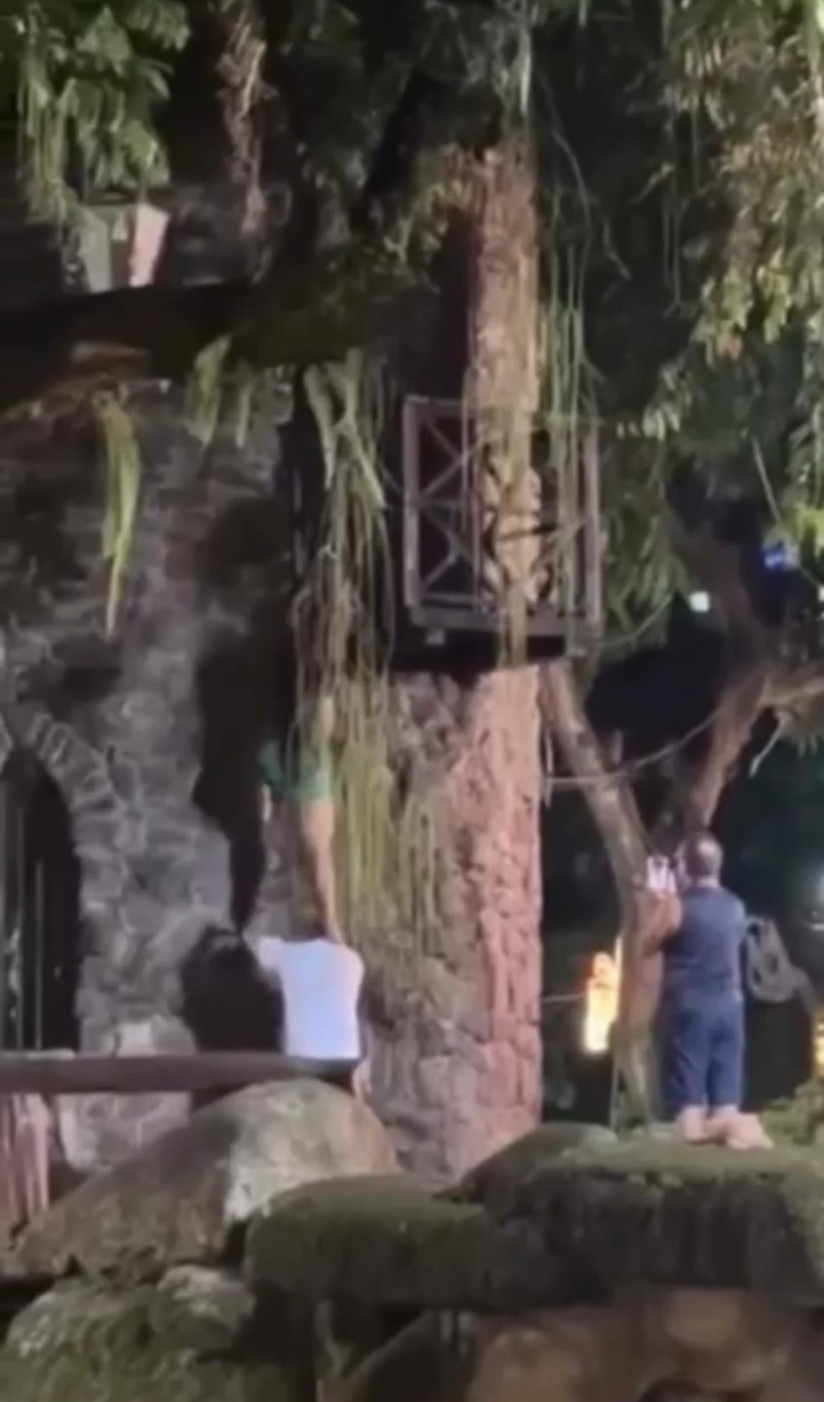 As imagens mostram o homem ajudando a mulher a subir na parte externa da estrutura. Em alguns momentos, ela grita pedindo ajuda para se apoiar.