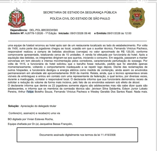 Contudo, o caso ganhou uma reviravolta após o registro de um Boletim de Ocorrência pela administração do estabelecimento. Enquanto o clube alegou sabotagem, o documento policial, obtido pelo Núcleo de Esportes do Cidade 091 juntamente com o hotel, narra um cenário de consumo de álcool e perturbação do sossego pela comissão técnica.