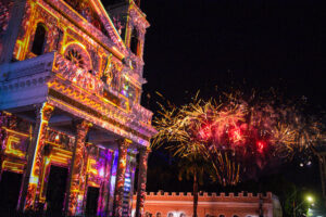 Encerrando a noite, o tradicional show de fogos piromusical terá cerca de cinco minutos de duração, com 600 candelas e 10 tortas de efeitos visuais em formatos Z e W, de baixo ruído, para manter o caráter devocional do momento. A estrutura será montada no Coração Imaculado de Maria (CIM).