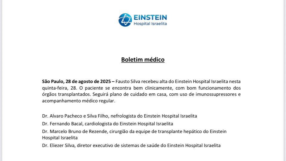 O apresentador Fausto Silva, de 75 anos, recebeu alta nesta quinta-feira (28) do Hospital Albert Einstein, em São Paulo, após três meses internado. De acordo com boletim médico, Faustão “se encontra bem clinicamente, com bom funcionamento dos órgãos transplantados” e seguirá tratamento em casa, com uso de imunossupressores e acompanhamento médico regular.