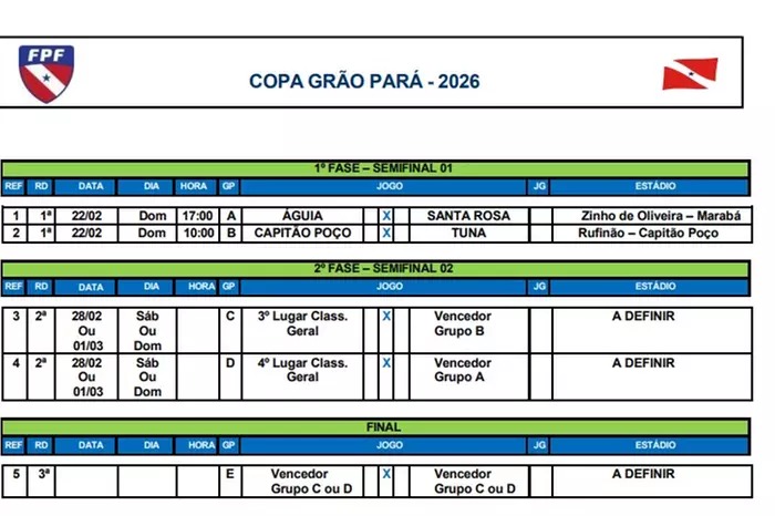 A Federação Paraense de Futebol (FPF) oficializou nesta sexta-feira o cronograma detalhado para a fase de abertura da Copa Grão-Pará. O torneio reúne os clubes que foram eliminados durante as quartas de final da elite do campeonato estadual.