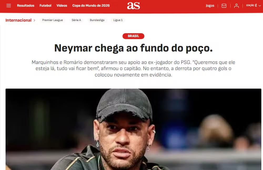 A ausência de Neymar na convocação da seleção brasileira voltou ao centro do debate internacional. Em reportagem, o jornal espanhol AS destacou a repercussão em torno do atacante, que ficou fora da lista para os amistosos contra França e Croácia e, ao mesmo tempo, virou notícia por sua rotina fora de campo.