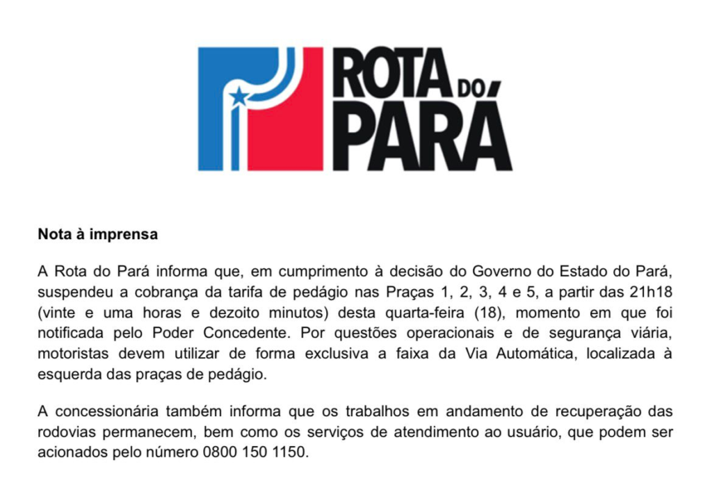 Em nota, a concessionária Rota do Pará informou que suspendeu a cobrança das tarifas e orientou que, por questões operacionais e de segurança, os motoristas utilizem exclusivamente a faixa automática, localizada à direita das praças.