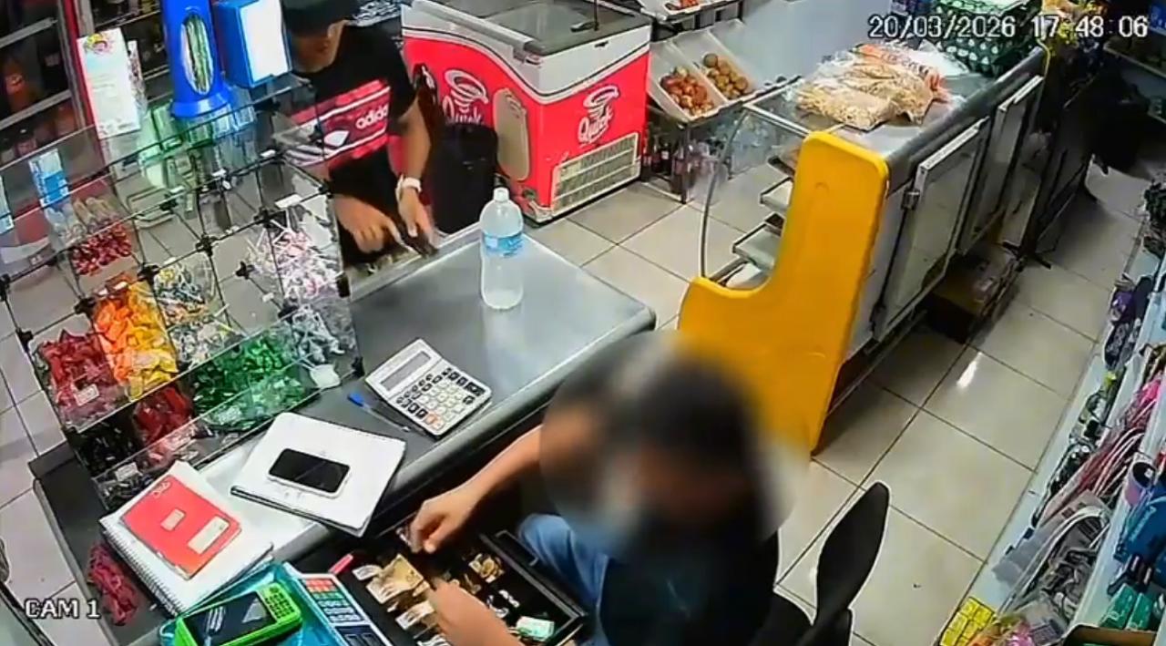 Câmeras de segurança registraram um assalto na tarde desta sexta-feira (20), no conjunto Rio Volga, bairro do Tapanã, em Belém. Era por volta das cinco horas da tarde quando o suspeito chegou ao estabelecimento, entrou fingindo ser cliente e pegou uma garrafa de água. Em seguida, ele se dirigiu ao caixa, onde anunciou o assalto. O criminoso rendeu o funcionário, exigiu o cordão que ele usava e, após receber a joia, também levou o dinheiro do caixa e o celular da vítima. Toda a ação foi rápida e durou menos de cinco minutos.