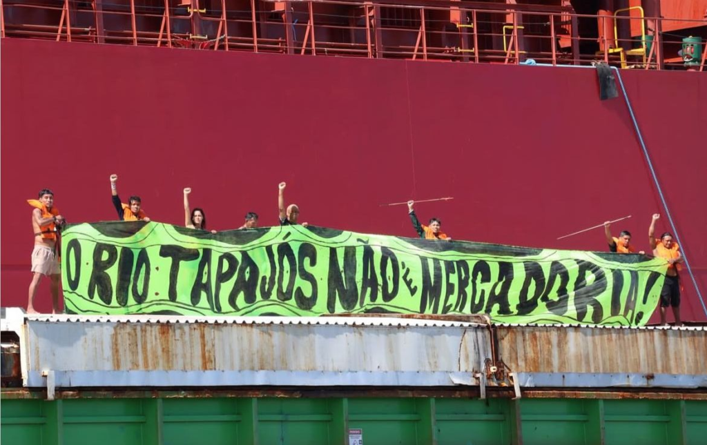 A mobilização, iniciada em janeiro por indígenas do Baixo e Médio Tapajós, já reúne cerca de 1,2 mil pessoas e pede a revogação do Decreto 12.600/2025, que autoriza a concessão de hidrovias à iniciativa privada, e que vai impactar o rio Tapajós, Madeira e Tocantins. No ato, os indígenas mergulharam e nadaram no rio até a área de cargas da Cargill e exibiram faixas com palavras de ordem. O ato foi acompanhado de perto pela Polícia Federal e Marinha.