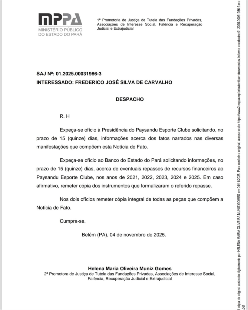 Conforme despacho datado de 4 de novembro de 2025, a promotora Helena Maria Oliveira Muniz Gomes determinou a expedição de dois ofícios: um ao clube requerendo a remessa, em até 15 dias, de documentação sobre os fatos apontados na denúncia; e outro ao Banco do Estado do Pará (Banpará) solicitando esclarecimentos sobre eventuais repasses ao clube, bem como envio dos contratos ou instrumentos formais que embasam tais operações.
