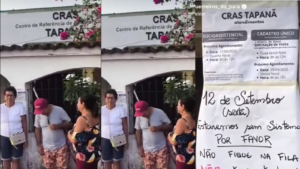 “Olha aqui essa palhaçada, gente na fila, que estava com atendimento marcado para hoje. Ai a gente chega e tem um aviso aqui dizendo que hoje, sexta-feira, eles estão fora de sistema (sem sistema) e o próximo atendimento só quarta-feira, 17, de 8h às 12h. Estão a semana toda sem atender aqui. Gente com criança no colo. Eu cheguei 5 e pouco da manhã. É uma vergonha, um descaso com a população que falta o trabalho para vir aqui atrás desse atendimento”, conta uma moradora.
