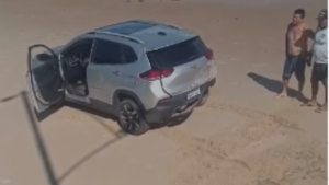Imagens gravadas por moradores do local mostram o automóvel já sobre a areia, após ultrapassar a calçada. No vídeo, uma das pessoas que registram o momento comenta: “O motorista passou direto”.