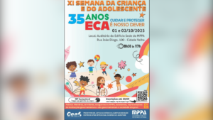 Com o tema “35 anos do ECA – Cuidar e proteger é nosso dever”, o evento é promovido pela Promotoria de Justiça da Infância e Juventude de Belém, com apoio do Centro de Apoio Operacional da Infância e Juventude (CAOIJ) e do Centro de Estudos e Aperfeiçoamento Funcional (CEAF). O objetivo é fortalecer o debate sobre os direitos de crianças e adolescentes, em articulação com a rede de proteção.