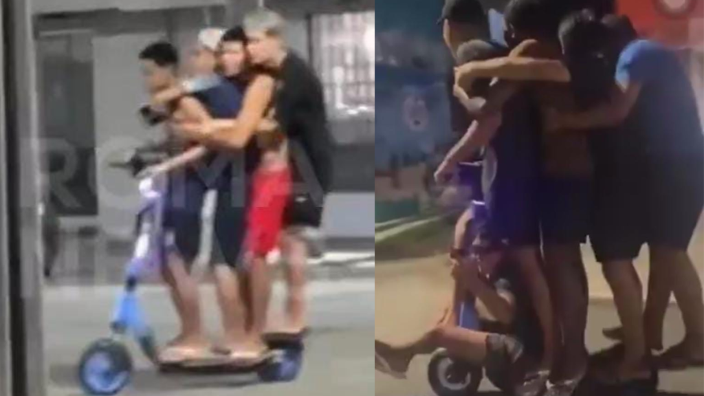 Quatro e até cinco pessoas já foram registradas sendo transportadas de forma irregular em patinetes elétricos em Belém. Reprodução: redes sociais.