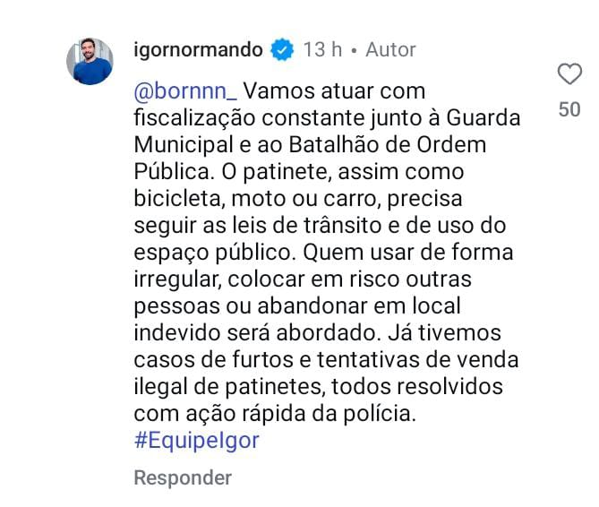 “Vamos atuar com fiscalização constante junto à Guarda Municipal e ao Batalhão de Ordem Pública. O patinete, assim como bicicleta, moto ou carro, precisa seguir as leis de trânsito e de uso do espaço público. Quem usar de forma irregular, colocar em risco outras pessoas ou abandonar em local indevido será abordado. Já tivemos casos de furtos e tentativas de venda ilegal de patinetes, todos resolvidos com ação rápida da polícia”, disse em comentário nas redes sociais.