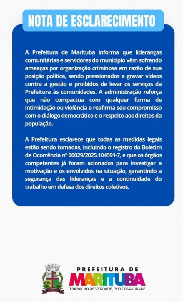 “Divulgamos esse comunicado para tranquilizar a população. Infelizmente, nos últimos três dias, várias lideranças comunitárias do nosso município têm sofrido ameaças por uma determinada facção criminosa. Pediram para eles (as lideranças) gravarem vídeos dizendo que estão saindo da nossa gestão, que estão insatisfeitos com o governo. Proibindo essas lideranças de levarem serviços aos seus bairros. Querendo proibir nossa gestão de fazer as coisas acontecerem. Digo aqui a todas as nossas lideranças, fiquem tranquilos. Tem pessoas que por interesse próprio, prejudicam bairros e a população através de facção criminosa. Mas nosso trabalho não vai parar. Nossa gestão sabe o trabalho que a gente desenvolve em Marituba e não vamos parar. Todas as redes de apoio sobre segurança pública foram acionadas. Já liguei para o governador, para o comandante geral da Polícia Militar, para o secretário de segurança pública e para o delegado geral, o Benassuly. Grandes operações vão acontecer em Marituba nos próximos dias. Nosso trabalho não vai parar, os serviços vão continuar chegando nas comunidades. Eu vim aqui para tranquilizar o líderes comunitários e a nossa população”, explica.