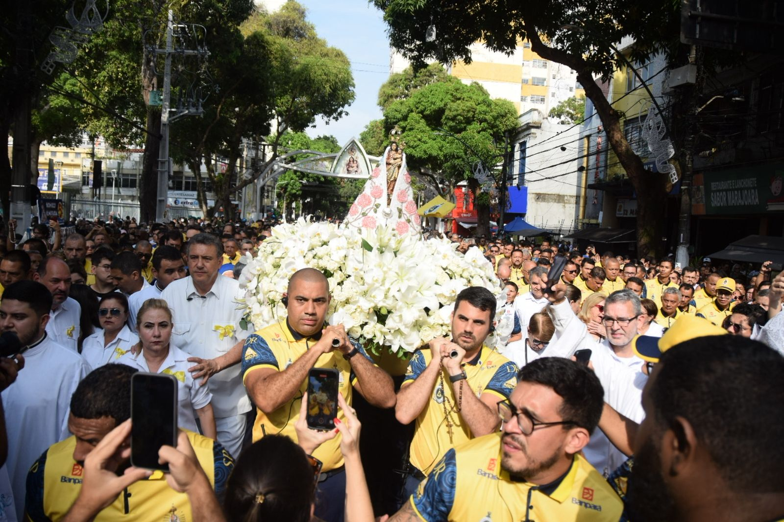 Às 6h30, devotos acompanharam a cerimônia da subida da imagem original, encontrada por Plácido em meados de 1700 e guardada no ponto mais alto da Basílica. Logo depois, às 7h, foi celebrada a missa. Em seguida, a Imagem Peregrina seguiu em direção ao Colégio Gentil Bittencourt em um andor decorado com rosas, lírios e orquídeas brancas, simbolizando paz, amor e pureza.