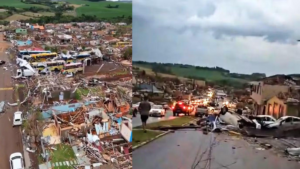 Em Rio Bonito do Iguaçu, de cerca de 14 mil habitantes, o cenário é de devastação total — 80% da cidade foi destruída, segundo a Defesa Civil. Casas foram arrancadas do chão, árvores e postes tombaram, e mais de mil pessoas estão desabrigadas. Bombeiros e voluntários seguem em busca de sobreviventes sob os escombros.