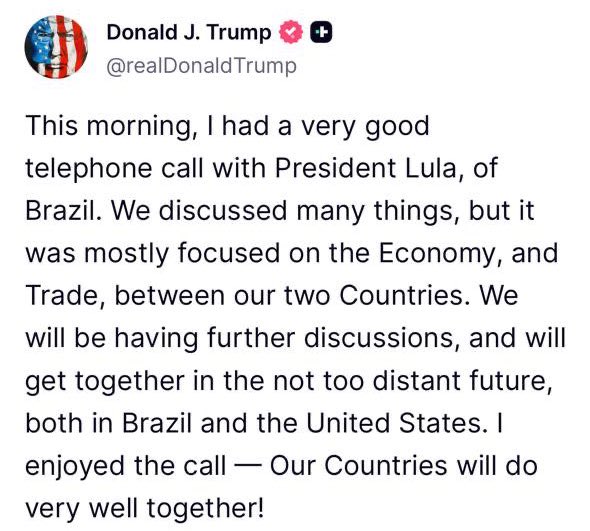 Trump também indicou que haverá novos contatos entre os dois líderes e afirmou que eles devem se reunir num futuro “não muito distante”, tanto no Brasil quanto nos EUA. Na postagem, ele destacou que ficou satisfeito com a conversa e expressou otimismo, dizendo que os países “irão prosperar juntos”.