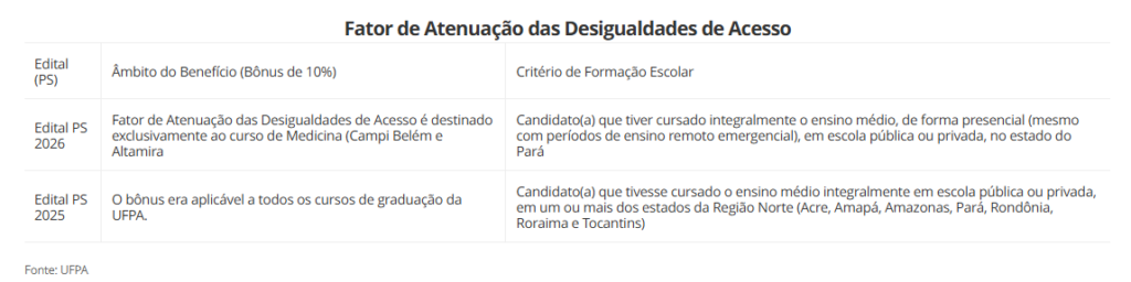 Entre as principais novidades, está a alteração no bônus de 10%, conhecido como “Fator de Atenuação das Desigualdades de Acesso”. Diferentemente dos anos anteriores, o benefício será aplicado apenas aos candidatos aos cursos de Medicina em Belém e Altamira. No último edital, o bônus valia para todos os cursos da universidade.