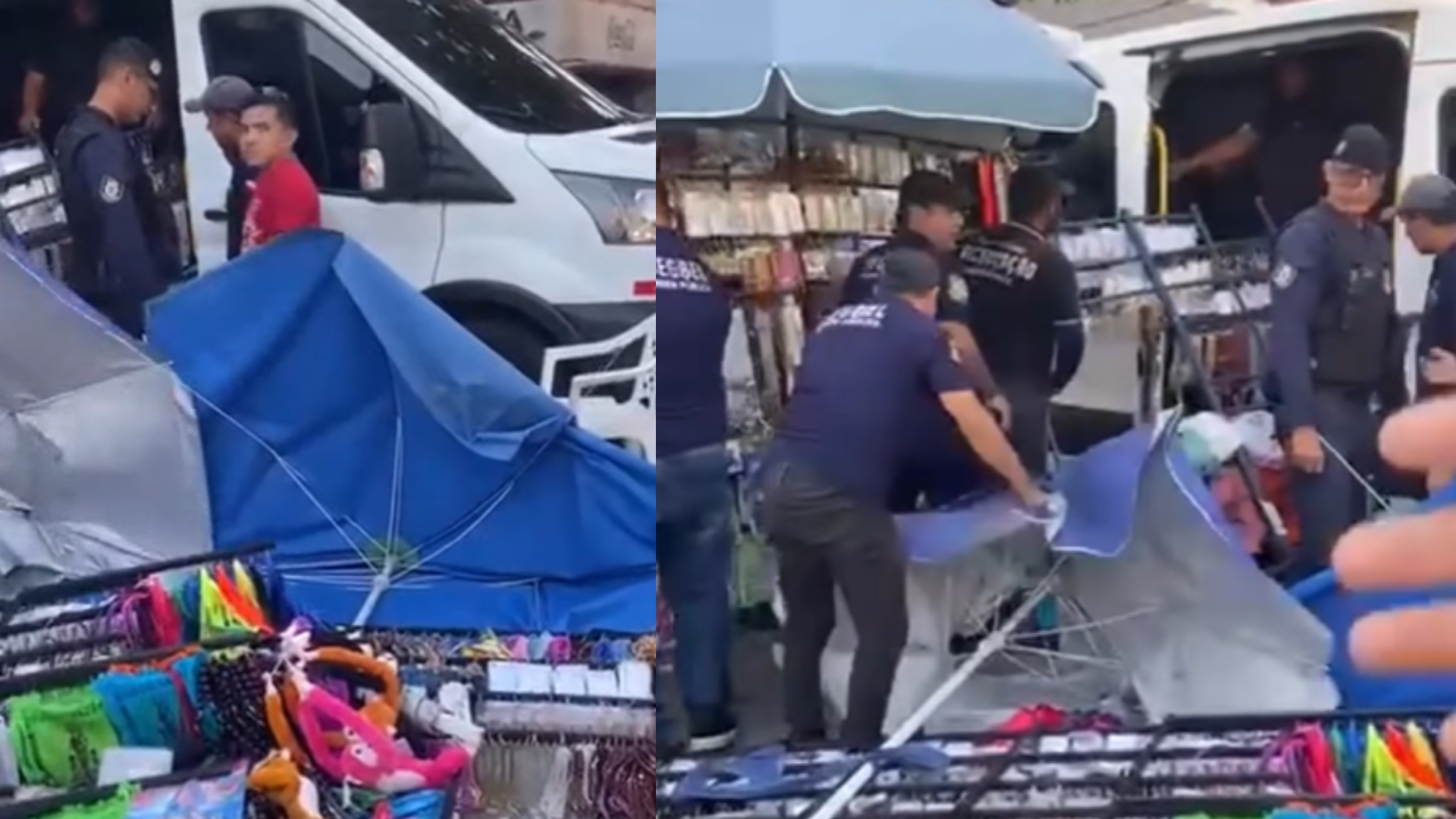 Imagens registradas no centro de Belém mostram agentes da Guarda Municipal agredindo ambulantes durante uma operação de fiscalização na sexta-feira, 18. No vídeo, é possível ver o momento em que um dos guardas chuta mercadorias espalhadas no chão, enquanto outro fecha de forma brusca um guarda-sol usado por um dos vendedores. Todo o material recolhido foi colocado dentro de uma van da prefeitura.