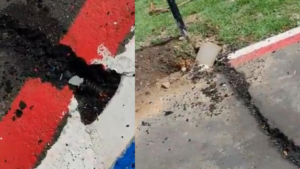 Conforme o homem relata, indivíduos estão abrindo o asfalto da ciclovia para furtar fios de cobre, o que resulta em postes sem luz. Ainda segundo o homem narra, a iluminação dos postes também é furtada e não há ação das autoridades para coibir o delito.